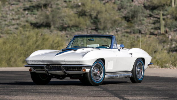 Only one 1967 Corvette convertible was finished in Ermine White with a White and Bright Blue interior and the L71 big block.