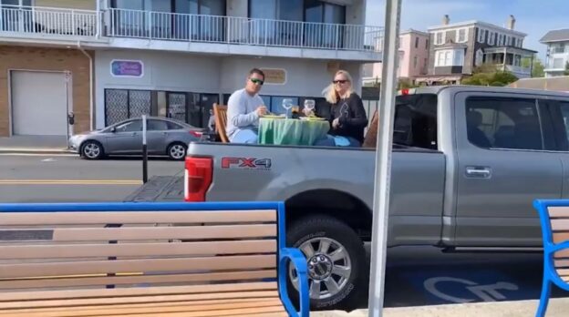 Clever couple finds a way to keep things fun during stay at home situation, turning their truck into a private dining patio.