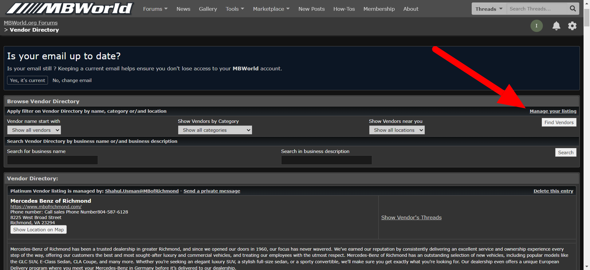 In the top right corner of the VD page you may now select the Manage Your Listing link, which will take you directly to the editing tool. The screenshot below shows what this link looks like.